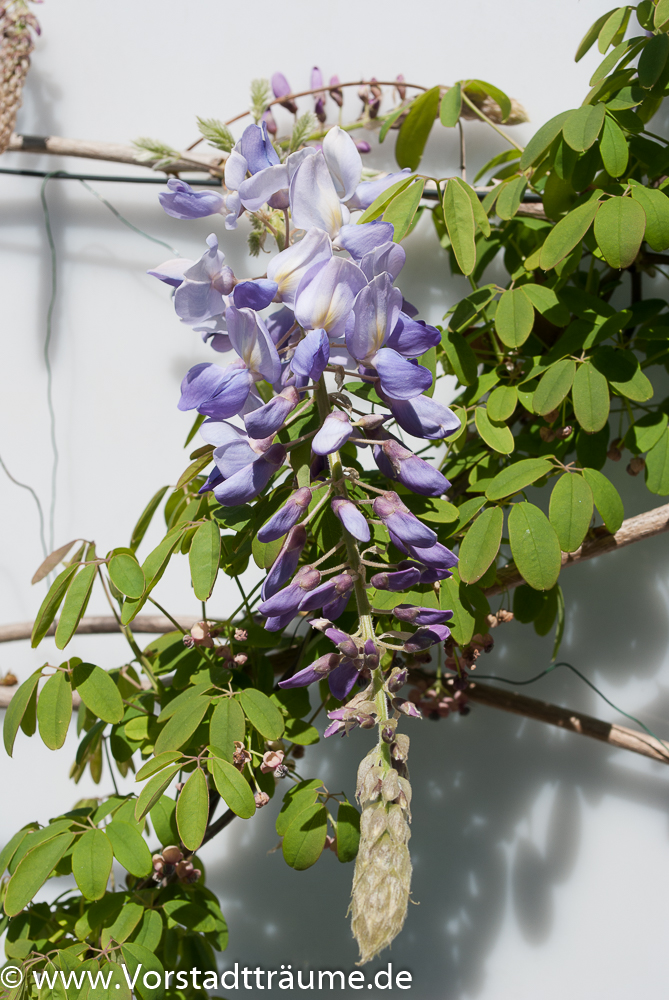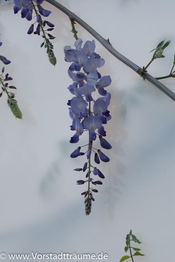 Der Blauregen ist eine der prächtigsten blühenden Kletterpflanzen, die wir hier zu Lande antreffen. In den Städten lohnt sich im Mai der Blick nach oben, denn viele Fassaden werden mit dem schnell wachsendem Blauregen begrünt. Aber es ist hier auch Vorsicht geboten. Die Äste des Blauregens können soviel Kraft entwickeln, dass sie Regenrennen und andere Gegenstände über die Jahre verformen. Aus diesem Grund bietet sich eine vom Haus oder anderen Gegenständen, die sie begrünen wollen,getrennte Rankhilfe an.