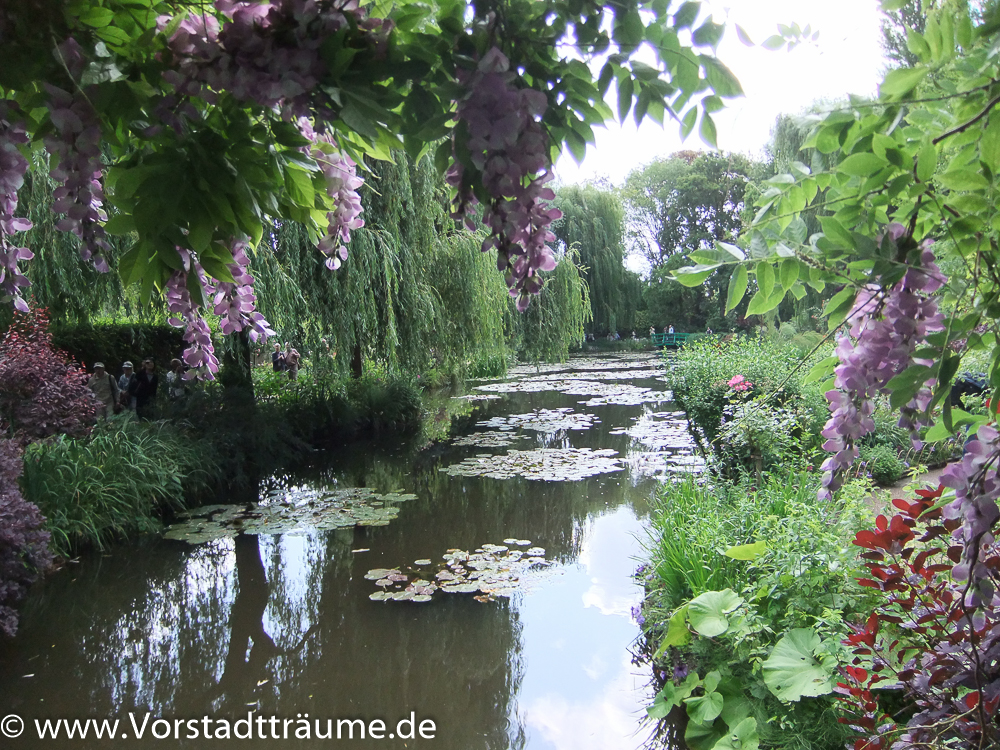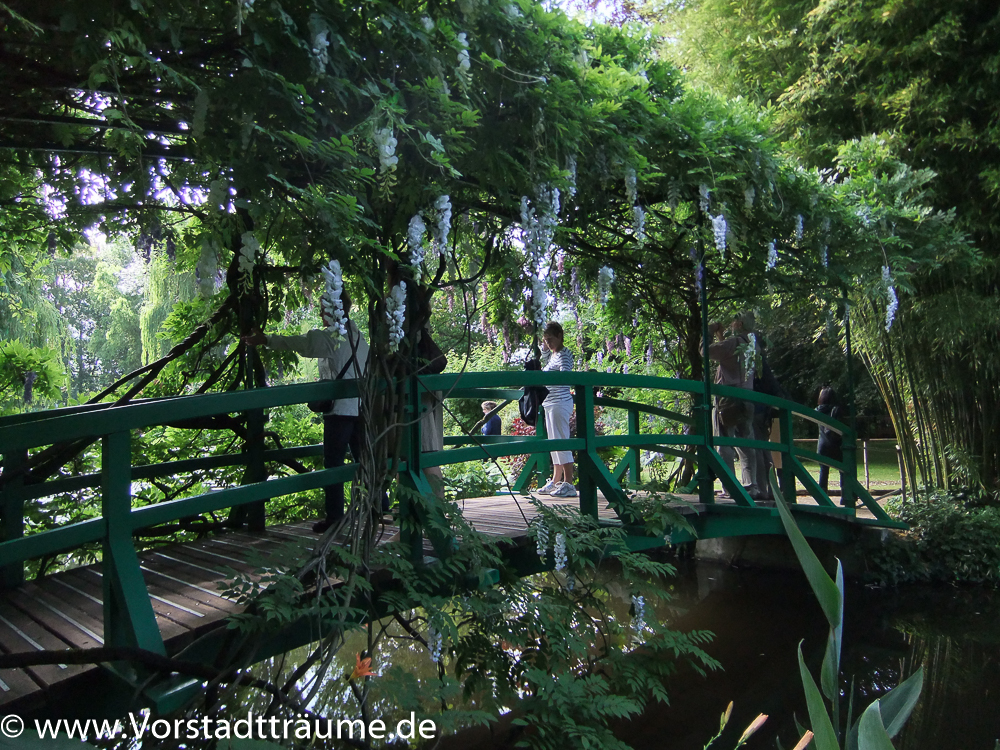 Schon Claude Monet pflanzte in seinem Garten in Giverny bei Paris Blauregen an eine Pergola über einer Brücke. Heute ist das Haus und der Garten ein Museum und damit der Blauregen das ganze Jahr blüht hängen hier Kunststoffblüten. Erkennt ihr das auf meinen Bildern?
