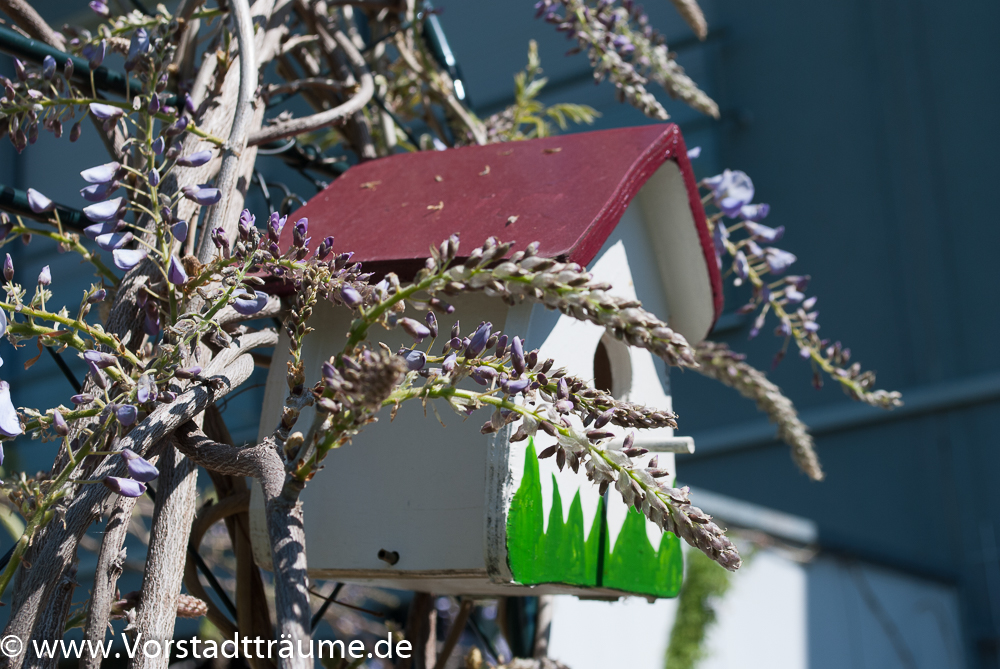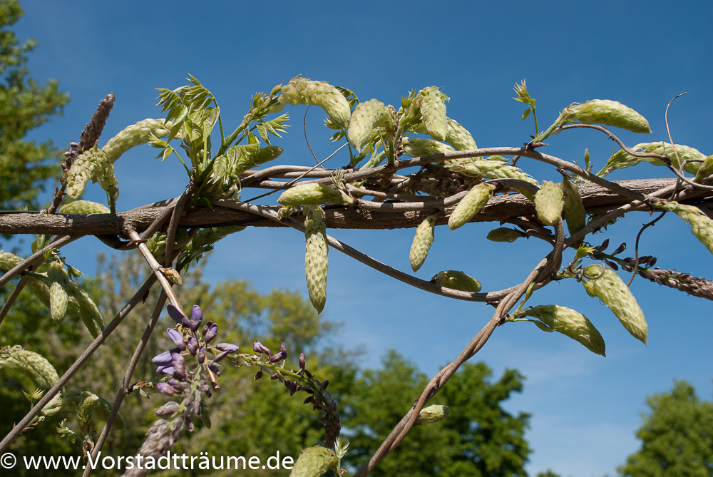 Bei uns im Garten bildet der Blauregen ein Teil des “Gartenzimmers Brücke”. Der blaue Blauregen rankt entlang unserer Brücke an ein Drahtkonstruktion, sowie über einen Rosenbogen auf die andere Seite um dort gemeinsam mit einem weißen Blauregen die Sichtschutzwand zu unserem Nachbarn zu begrünen.