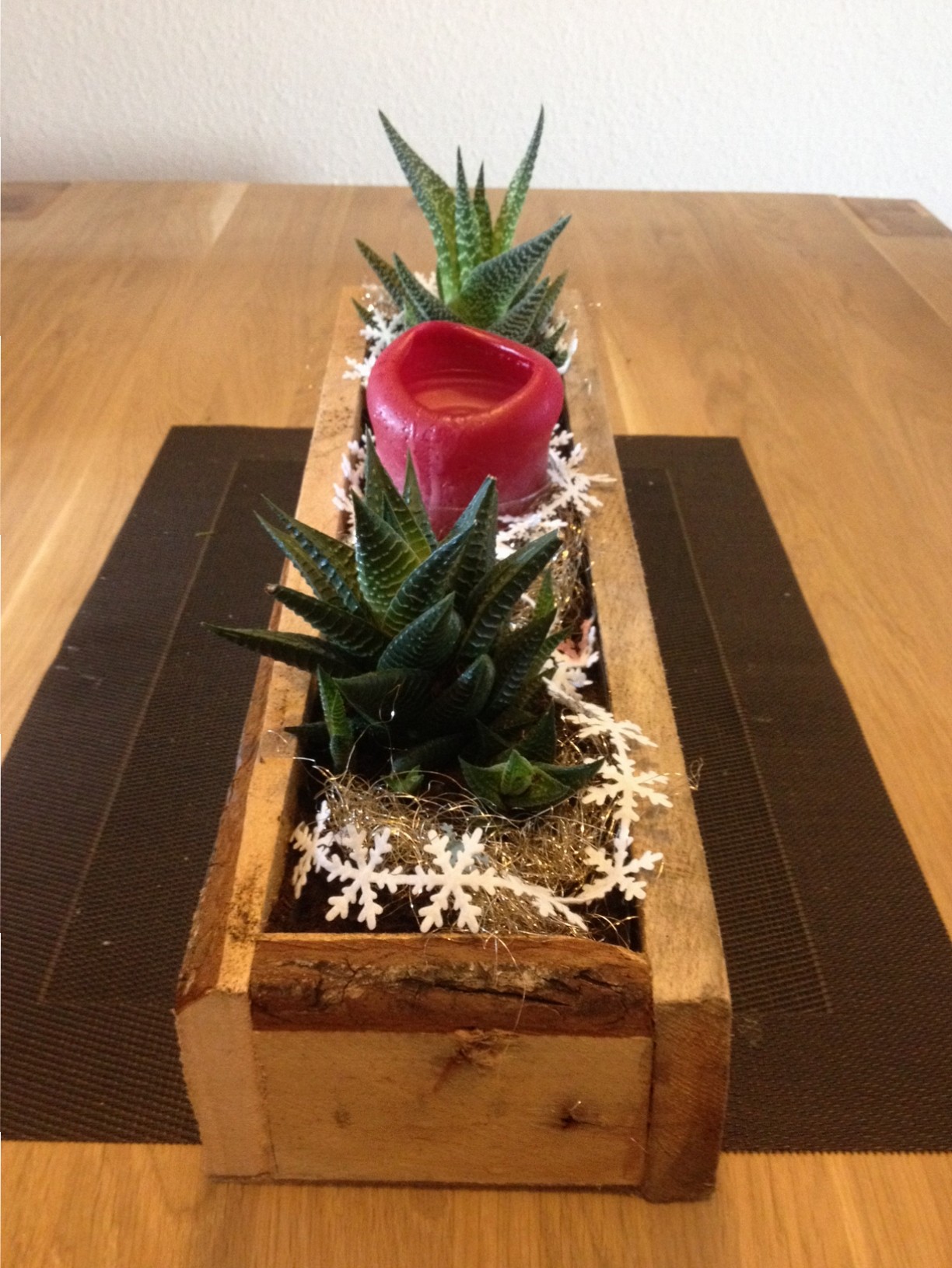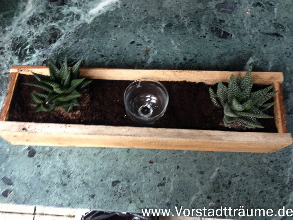 Den fertigen Blumenkasten habe ich mit Erde gefüllt und mit zwei Sukkulenten bepflanzt, sowie in die Mitte einen Kerzenhalter eingegraben.