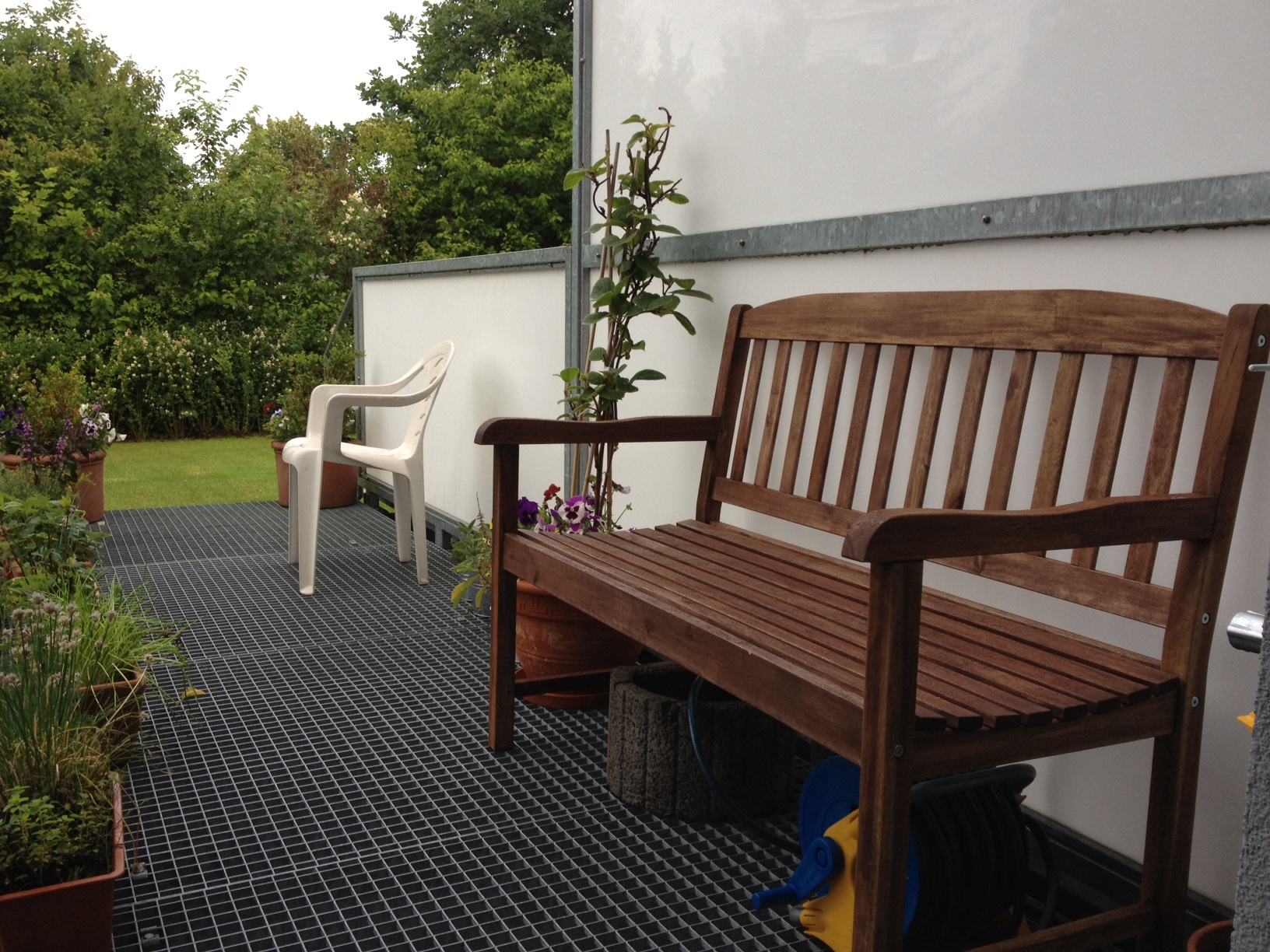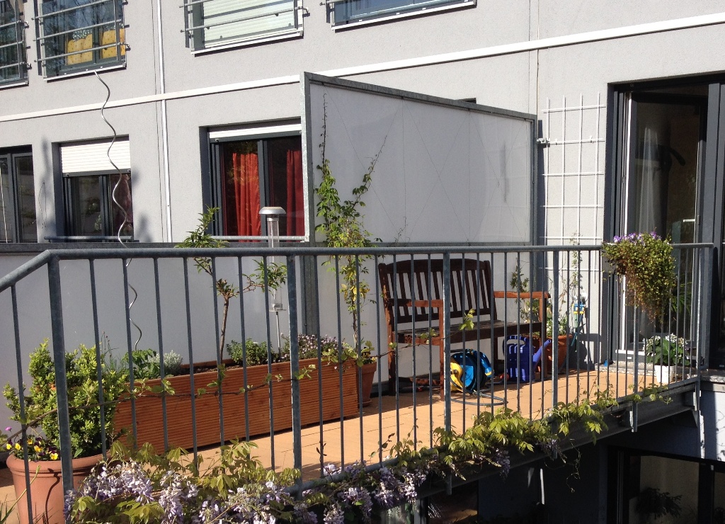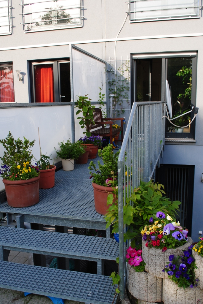 Wenn ich auf der Bank sitze wollte ich noch ein wenig Sichtschutz zu den Nachbarn haben und auf Augenhöhe etwas grünes. Am Geländer hängen daher noch zwei Blumenkästen, die ich jahreszeitlich bepflanze.