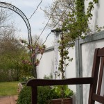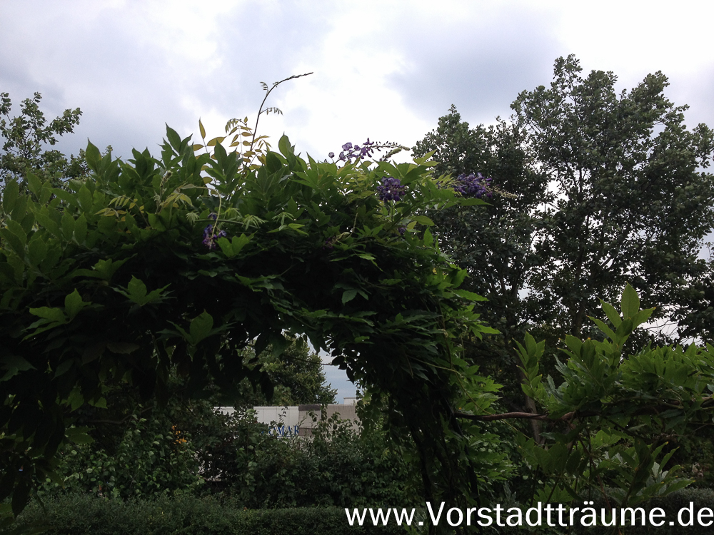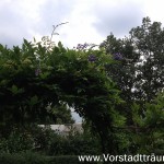 Gemeinsam mit meinem Nachbarn haben wir einen weiteren Blauregen gepflanzt der die Brücke und Sichtschutzwand auf beiden Seiten weiter begrünen sollte. Dazu habe ich am Ende der Brücke einen Rosenbogen gestellt, der das Eintreten in den Garten bewusster werden lassen soll und einen weiteren Sichtschutz bietet.