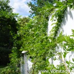 Da der Blauregen nur entlang des Träger der Brücke wächst habe ich mich dazu entschiedene dort eine Weinrebe zu setzten die in voller Sonne perfekt ihre Trauben entwickeln kann. Die Trauben sind toll zum Naschen und der Ertrag ist mittlerweile richtig groß. Im letzten Jahr habe ich Saft daraus gemacht und auch die Blätter finden gerne Verwendung in meiner Küche.