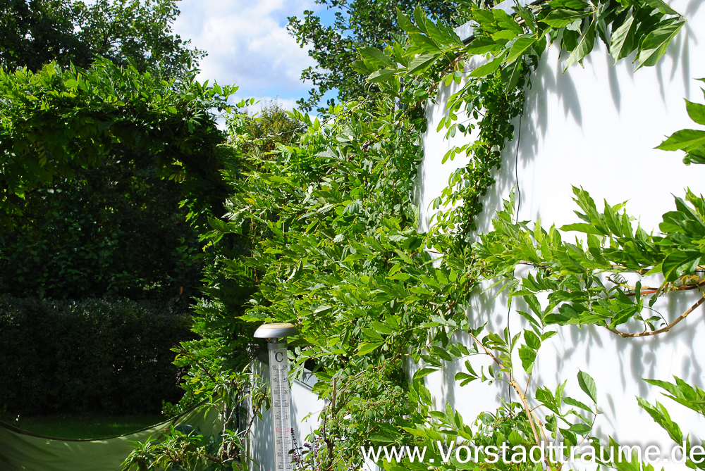 2013 habe ich die ersten Kletterpflanzen zum Begrünen der Brücke gepflanzt. Eine Climatis im Topf ganz hinten an der Hauswand und einen Blauregen der entlang der Brücke ranken darf.
