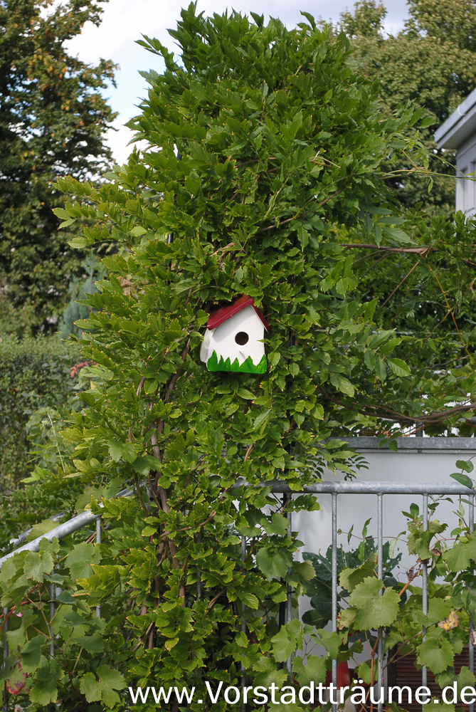 Im Blauregen hängt eins der Vogelhäuser die ich im letztem Jahr gebaut habe. Ein Bericht über meine Vogelhäuser findet ihr hier.