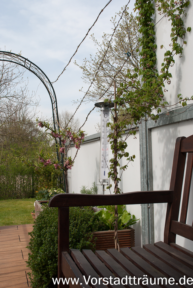 2012 war eine der ersten Anschaffungen für den Garten eine Bank um auf der Brücke sitzen zu können. Dort standen auch eine viel Zahl von Kästen und Töpfen, die ich aus meiner alten Wohnung mitgebracht hatte. Doch im Sommer musste ich feststellen, dass es für die Blumen im Kasten dort einfach zu warm wurde. Ich musste diese zum Teil mehrmals am Tag gießen. Die Brücke ist der wärmste Ort mit den meisten Sonnenstunden in meinem Garten.