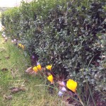 - Die Buchsbaumhecke die den Garten zum Nachbargrundstück abtrennt soll mit Krokussen unterpflanzt werden und die ersten bunten Blumen im Frühjahr darstellen.
