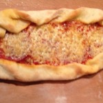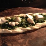 Teig auf einer bemehlten Arbeitsplatte zu dünnen, länglichen Fladen ausrollen. Ich belege den Teig direkt auf dem Schieber mit dem ich den Fladen auf den Pizzstein transportiere. Wer keinen Pizzastein hat kann die Fladen auf ein gefettetes Backblech geben und dort belegen. Der Belag sollte nicht zu dick sein. Der Belag wird nur in der Mitte verteilt und im Anschluss der Rand bis zum Belag leicht eingerollt.