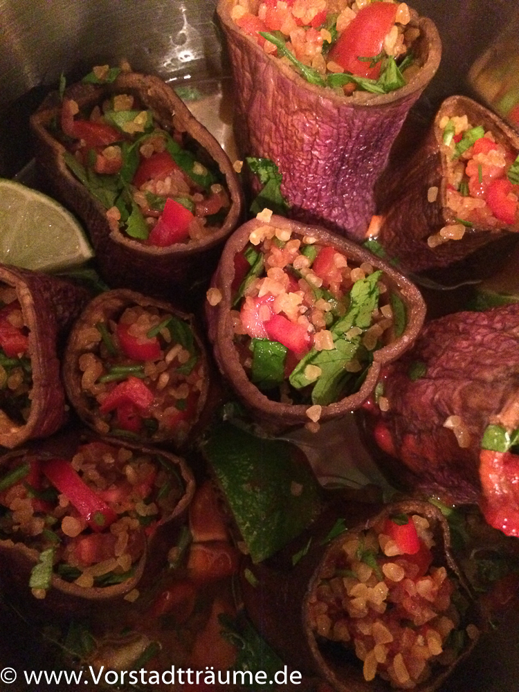 Die Auberginen in warmen Wasser einweichen bis sie hell und weicher sind. Für die Füllung die Zutaten klein schneiden, alles mischen und in die Auberginen einfüllen. Die Auberginen in einen Topf oder eine Auflaufform stellen. Den Topf oder die Form mit Wasser befüllen, sodass die Auberginen 3/4 im Wasser stehen. Den Saft einer Zitrone oder Limette dazu geben. Ca. 45 Minuten bei niedrigen Temperaturen auf dem Herd köcheln lassen oder bei 160°C im Backofen garen lassen.