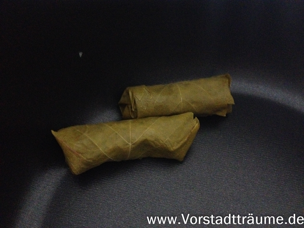 Bei kleiner Hitze ca. 35-45 Minuten garen lassen. Das Weinblatt und die Füllung sollten weich sein.