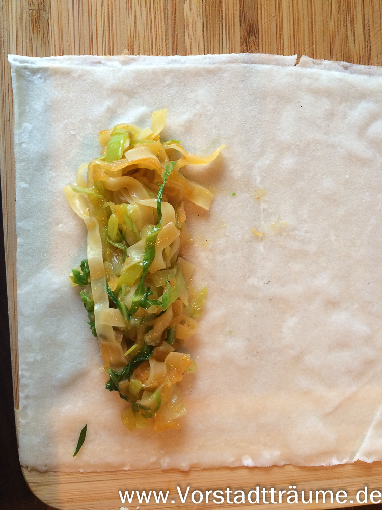 Ein bisschen der Füllung auf dem Teig platzieren.