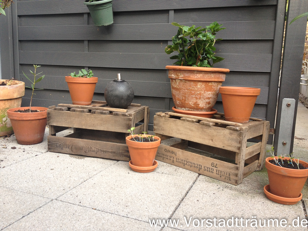 Die Weinkisten zu Schaffen von verschiedenen Ebenen habe ich vor eine Trennwand gestellt und verschiedenen Blumen darauf platziert. Mittlerweile sind die Kisten gut ein gewachsen und Rücken kleine Pflanzen in ein schönes Licht.