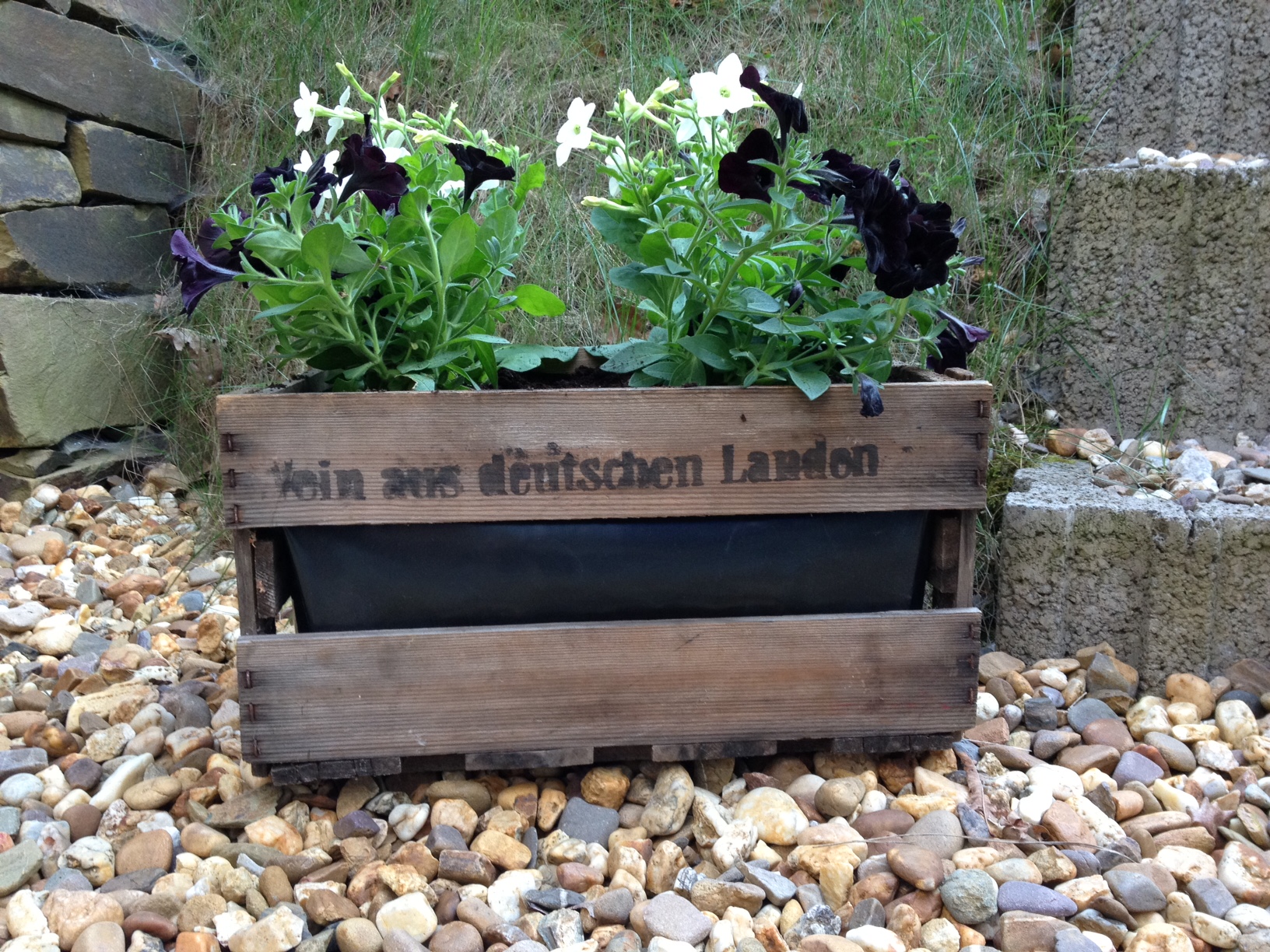 Die Weinkisten zum Bepflanzen habe ich zunächst mit Teichfolie ausgelegt und diese an den Seiten festgetacktert.  In die Folie habe ich am Boden ein paar Löcher gemacht damit überschüssiges Wasser ablaufen kann. Vor dem Einfüllen der Pflanzerde habe ich eine dünne Schicht Kies eingefüllt um die Entwässerung zu erleichtern. Danach konnte die Kiste mit Erde gefüllt und nach belieben bepflanzt werden. Ich habe die Kisten jetzt schon seit 3 Jahren und sie sind immer noch gut erhalten.