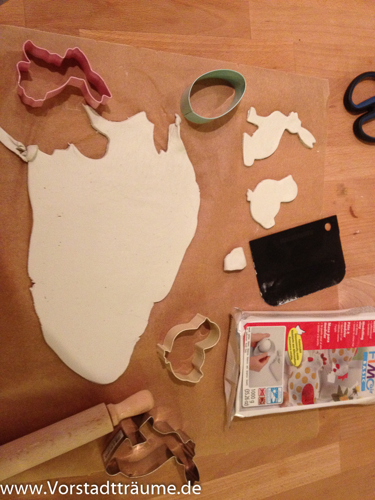 FIMO auf einer unterlagen auf die gewünschte Dicke ausrollen. Mit den Ausstechern die gewünschten Formen ausstechen. Mit der Teigkarte von der Unterlage lösen und auf ein Blech oder ähnliches zum Trocknen legen. Nach ca. 24 Stunden kann weiter gebastelt werden.