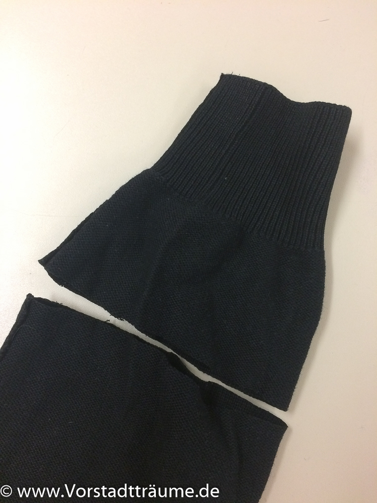 - Den Ärmel auf die gewünschte Länge abschneiden. Dabei solltet ihr bedenken, dass ein teil des Bündchens später umgeschlagen wird und vom unteren Teil ein paar cm für den Boden verloren gehen.