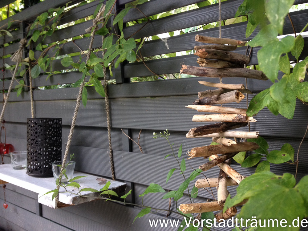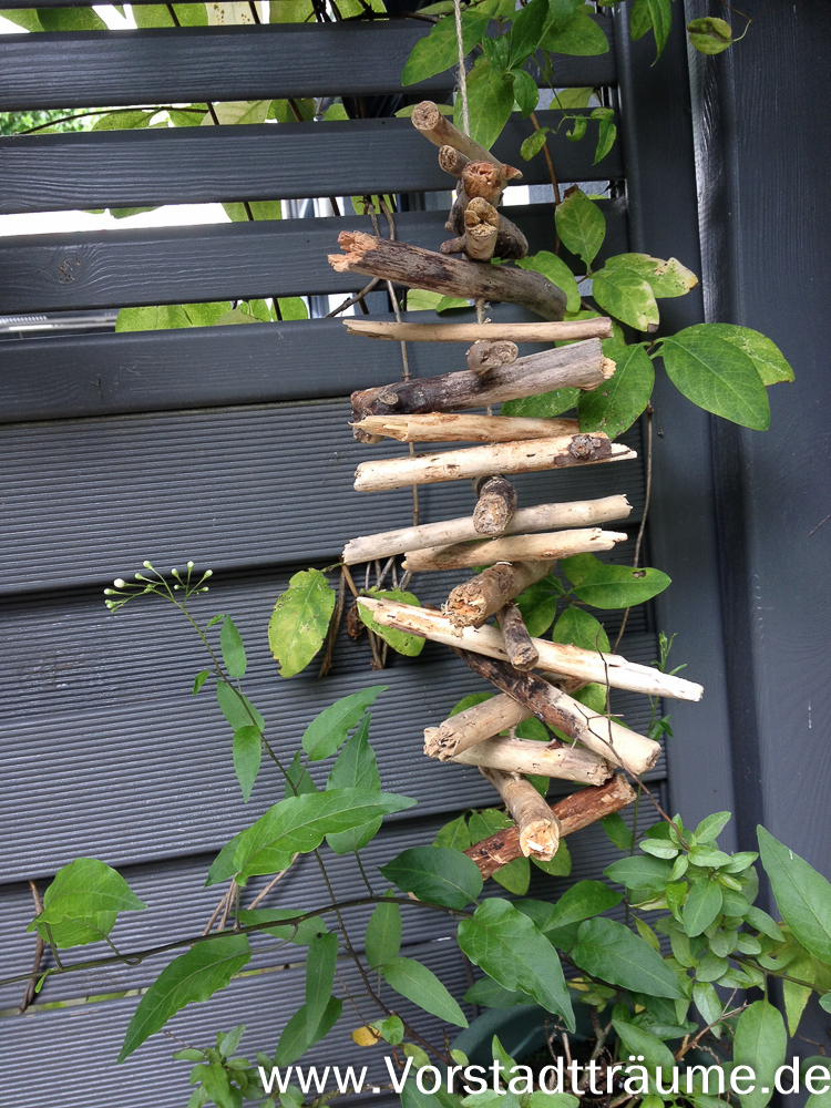 Für das Mobile gleichmäßig lange Treibhölzer aussuchen. In die Mitte jedes Holzes ein Loch bohren im etwa im Durchmesser der Schnur. Die Schnur durch die Löcher fädeln und zwischen jeden Holz in die Schnur einen Knoten machten.