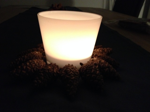 1. In die Tannenzapfen im unteren Drittel ein Loch bohren und den Draht durch stecken. Diesen Vorgang so lange wiederholen bis ihr aus dem mit Tannenzapfen bestücktem Draht einen Kreis formen könnt der um das Teelichtglas passt.